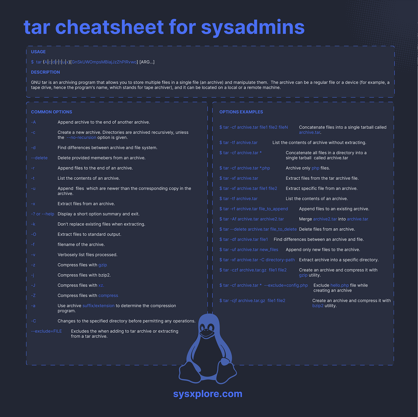 The picture below lists the most common options you can use with the tar command to perform different operations.