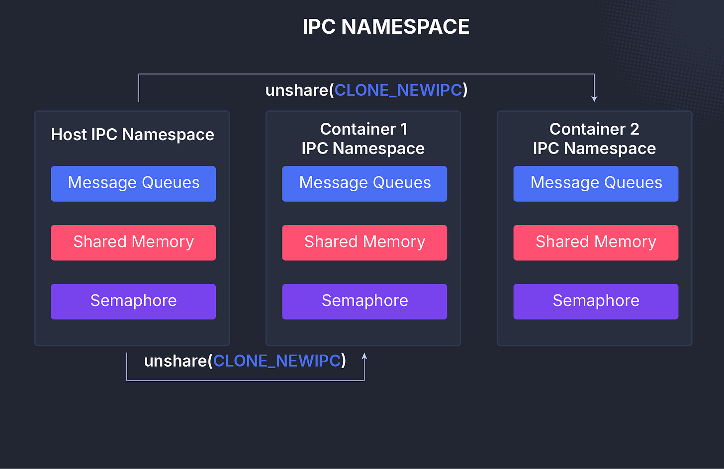 Each IPC namespace maintains its own identifiers and POSIX message queue filesystem, ensuring one container’s internal communications remain private.