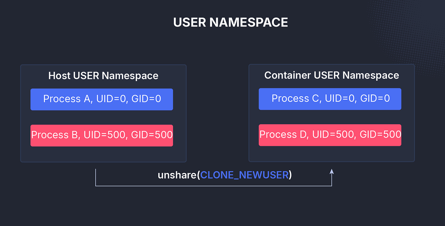 You can think of namespaces as a set of invisible containers around system resources. Each container defines what a process can “see”, whether that’s a process list, a network interface, or even the system clock.