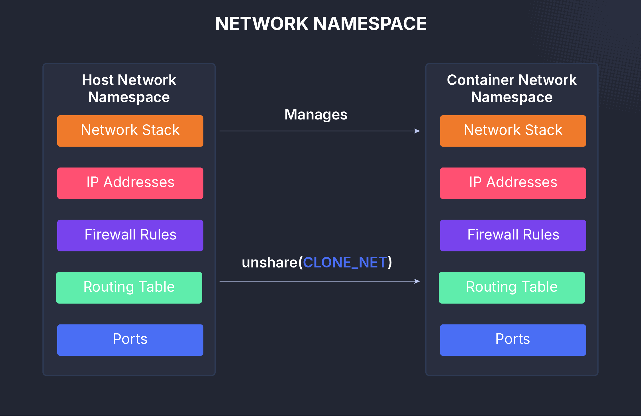 The network namespace provides isolation for everything related to networking, interfaces, routing tables, port numbers, ARP caches, and firewall rules.