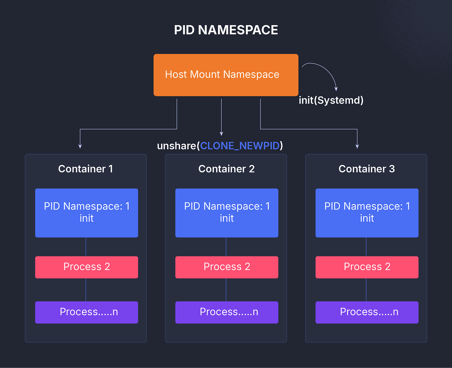 Each namespace has its own numbering system for processes, starting at PID 1, which acts like its own init process.