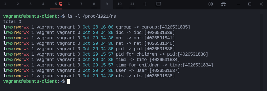$ ls -l /proc/1921/nsEach symbolic link in that directory corresponds to one namespace type.