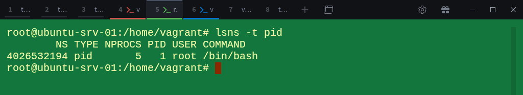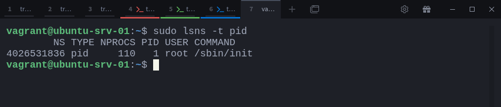 Run lsns -t pid inside child-ns-02 to verify the new namespaces that now exist: