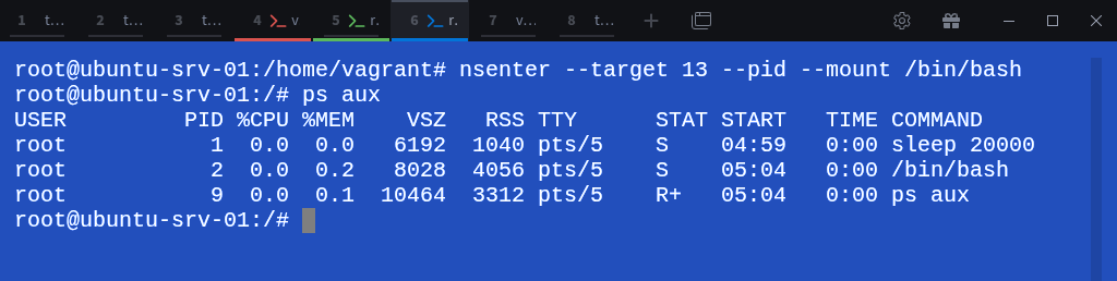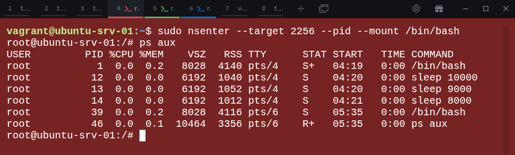 $ sudo nsenter --target 2256 --pid --mount /bin/bashThis opens a new shell inside the same PID and mount namespaces as the process with PID 2256.