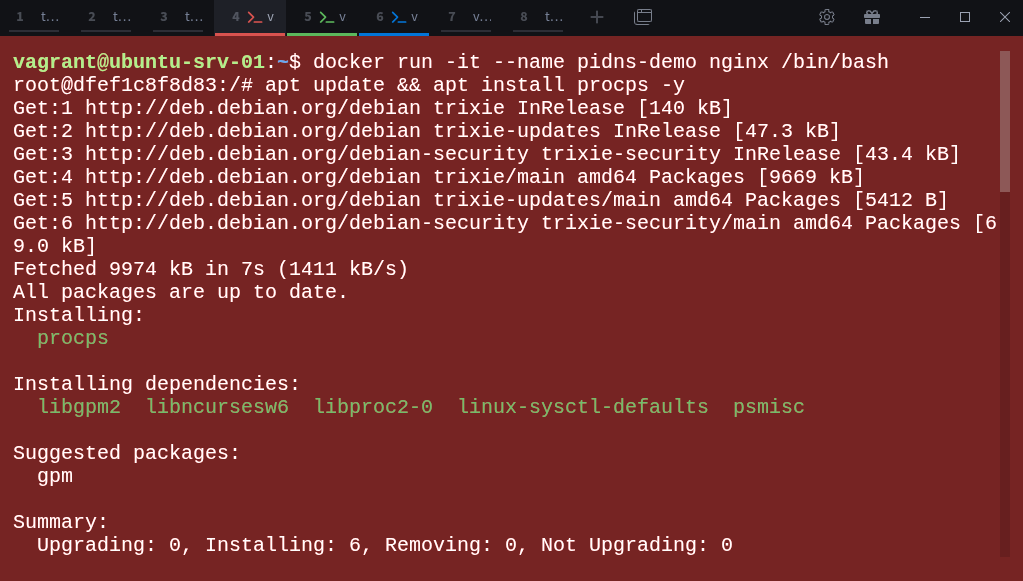 $ docker run -it --name pidns-demo nginx /bin/bashOnce inside the container, install the procps package (so we can use the ps command):