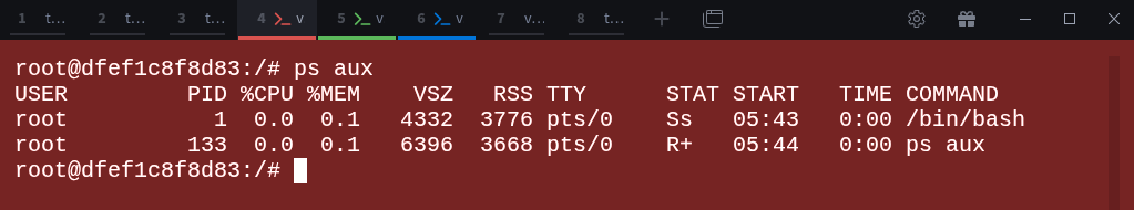 # ps auxHere, the container has its own PID namespace, with bash as PID 1 and ps as PID 133.