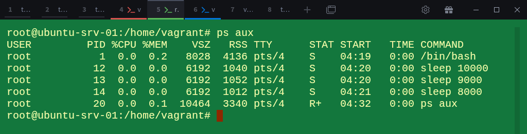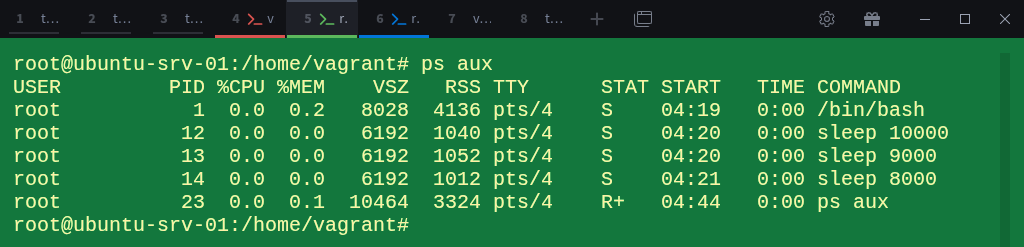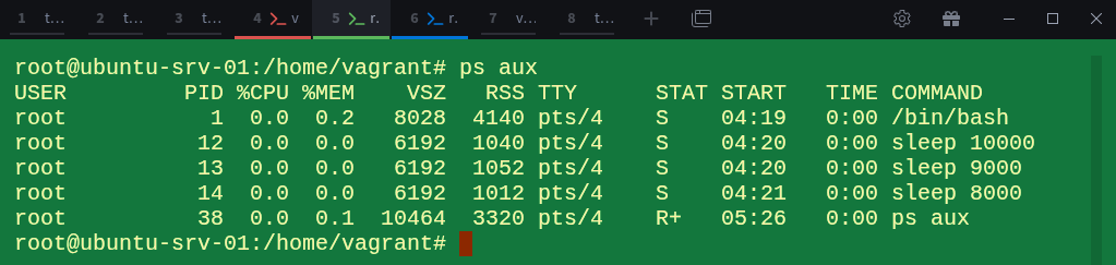 Inside the new PID namespace (child-ns-01), let’s create a few processes to see how they appear.