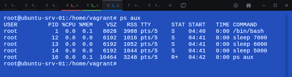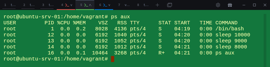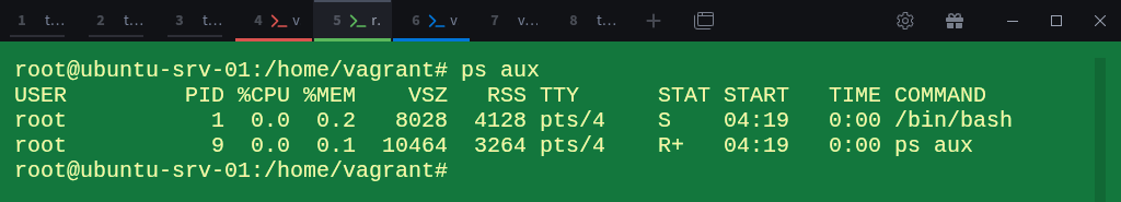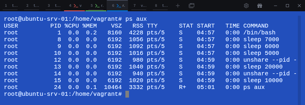 # ps auxNow return to the parent-ns terminal and check how these same processes appear from the host’s perspective: