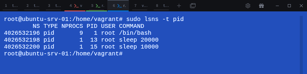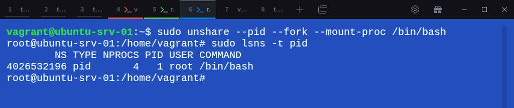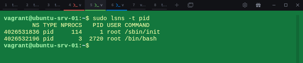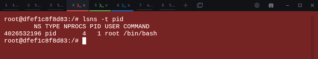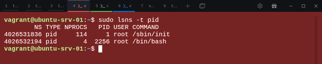 $ sudo lsns -t pidWe now have a new PID namespace with ID 4026532196.