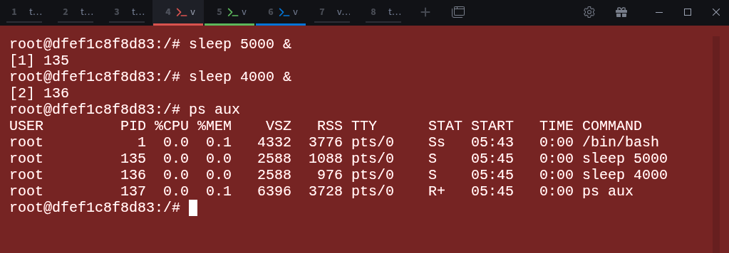 # ps auxFrom the output, each sleep command has its own unique PID within this namespace, starting from 1 for bash, then 12, 13, and 14 for the sleep processes and finally the 16 for the ps command we just ran.