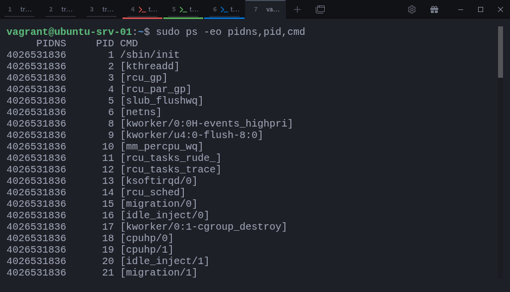 $ sudo ps -eo pid,pidns,cmd | grep 4026532194Notice how the PIDs differ.