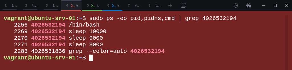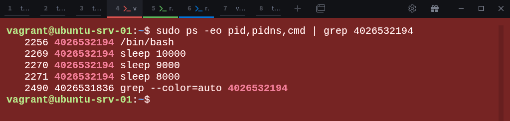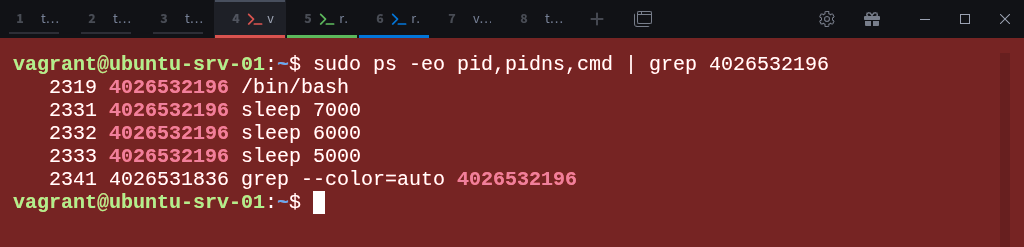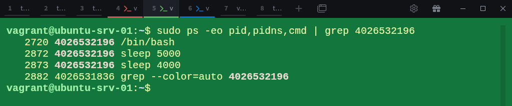 $ sudo ps -eo pid,pidns,cmd | grep 4026532196 Again, the parent namespace can see all the processes from this new child namespace.