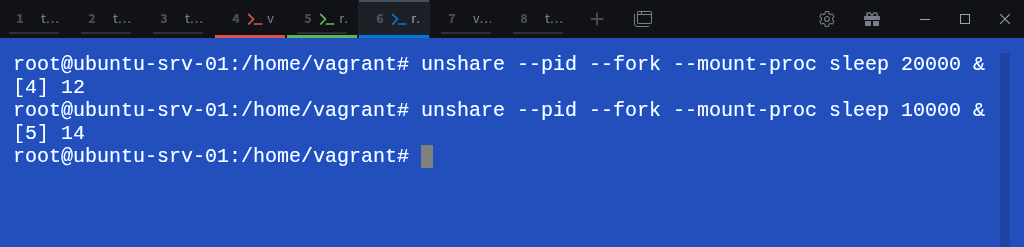 unsharecommand.child-ns-02 (blue): the third terminal, for creating another PID namespace again.