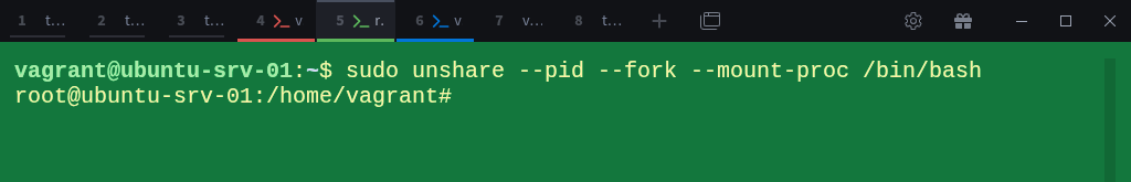 child-ns-01 (green): the second terminal, we’ll use this one to create a new PID namespace using the