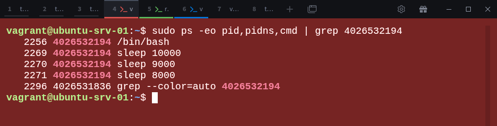 $ sudo ps -eo pid,pidns,cmd | grep 4026532194From this, you can see that process 2256 on the host corresponds to the bash process inside the PID namespace 4026532194.