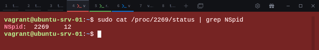 $ sudo cat /proc/2169/status | grep NSpidThis confirms that process 2269 in the parent namespace corresponds to PID 9 inside the child namespace, proving the hierarchical mapping between the two.