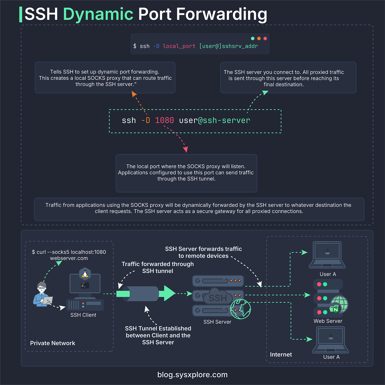 Instead of forwarding one specific port to one specific service, dynamic port forwarding turns SSH into a local proxy that can carry any TCP traffic through the connection. Because of this flexibility, an SSH session using dynamic forwarding can behave almost like a lightweight, application-level VPN.