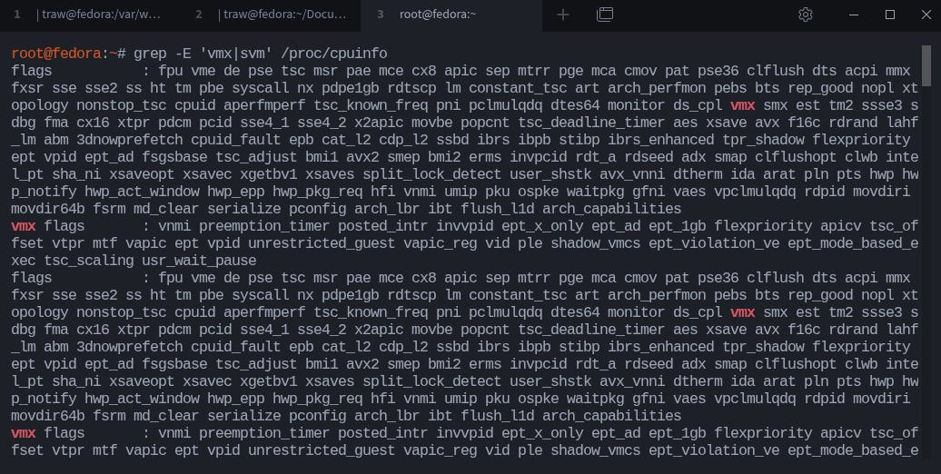 $ grep -E 'vmx|svm' /proc/cpuinfoThis command looks inside /proc/cpuinfo, which contains information about your processor, and searches for specific flags.
