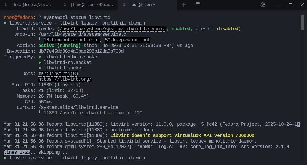 $ systemctl status libvirtdIf it is not running, start and enable it: