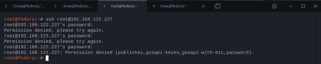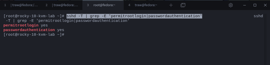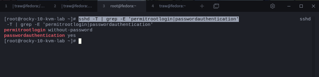 $ sshd -T | grep -E 'permitrootlogin|passwordauthentication'The output clearly explains why the login failed.