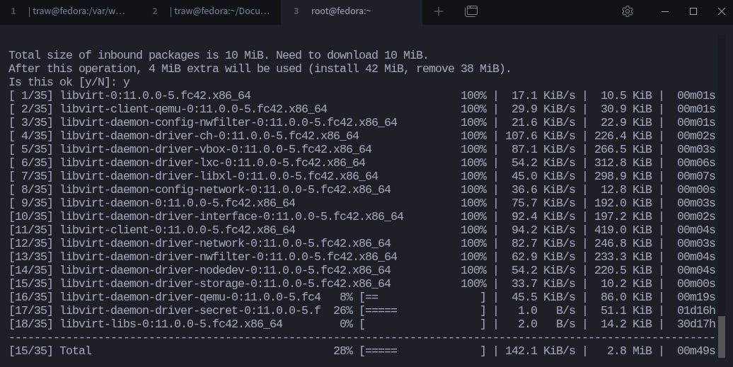 $ sudo dnf install qemu-kvm libvirt virt-install guestfs-tools genisoimage virt-manager virt-viewerThese packages give you everything needed to work with KVM.