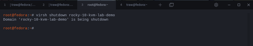 $ virsh shutdown rocky-10-kvm-lab-demoThis sends a shutdown signal to the guest operating system, allowing it to close services and unmount filesystems properly.