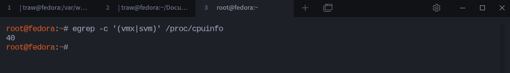 $ egrep -c '(vmx|svm)' /proc/cpuinfoA value greater than 0 confirms that virtualization is supported.