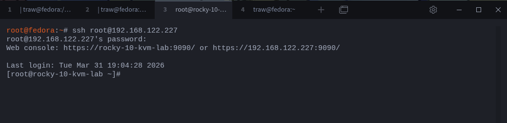$ ssh root@192.168.122.227If you prefer key-based authentication, you can inject an SSH key when preparing the image with virt-customize.