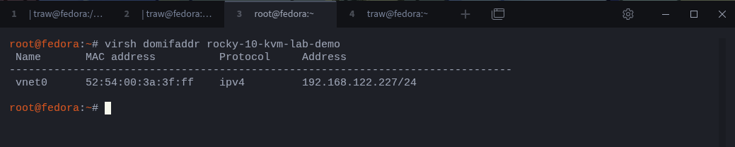$ sudo virsh domifaddr rocky-10-kvm-lab-demoThis command shows the network interfaces associated with the virtual machine, including the assigned IP address.